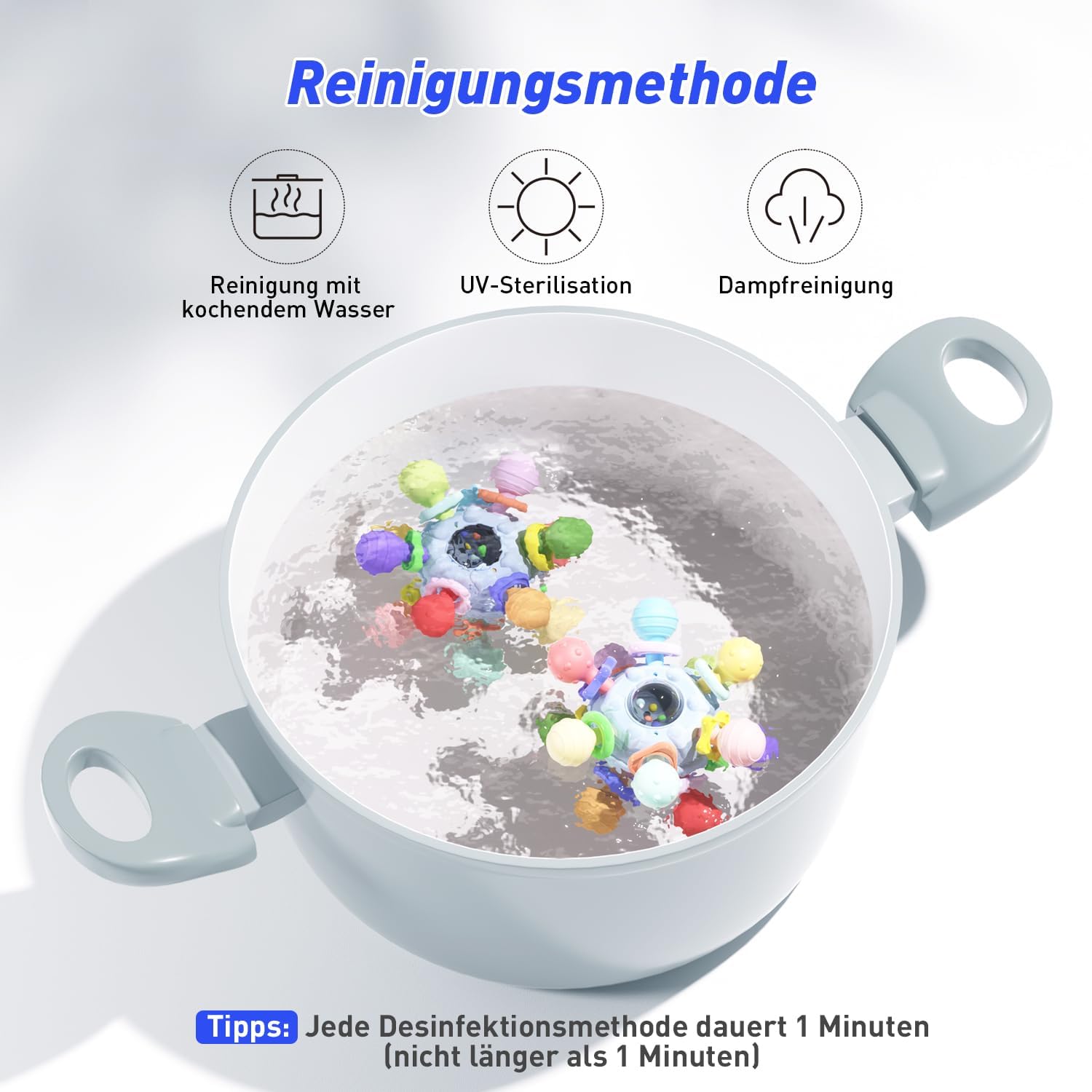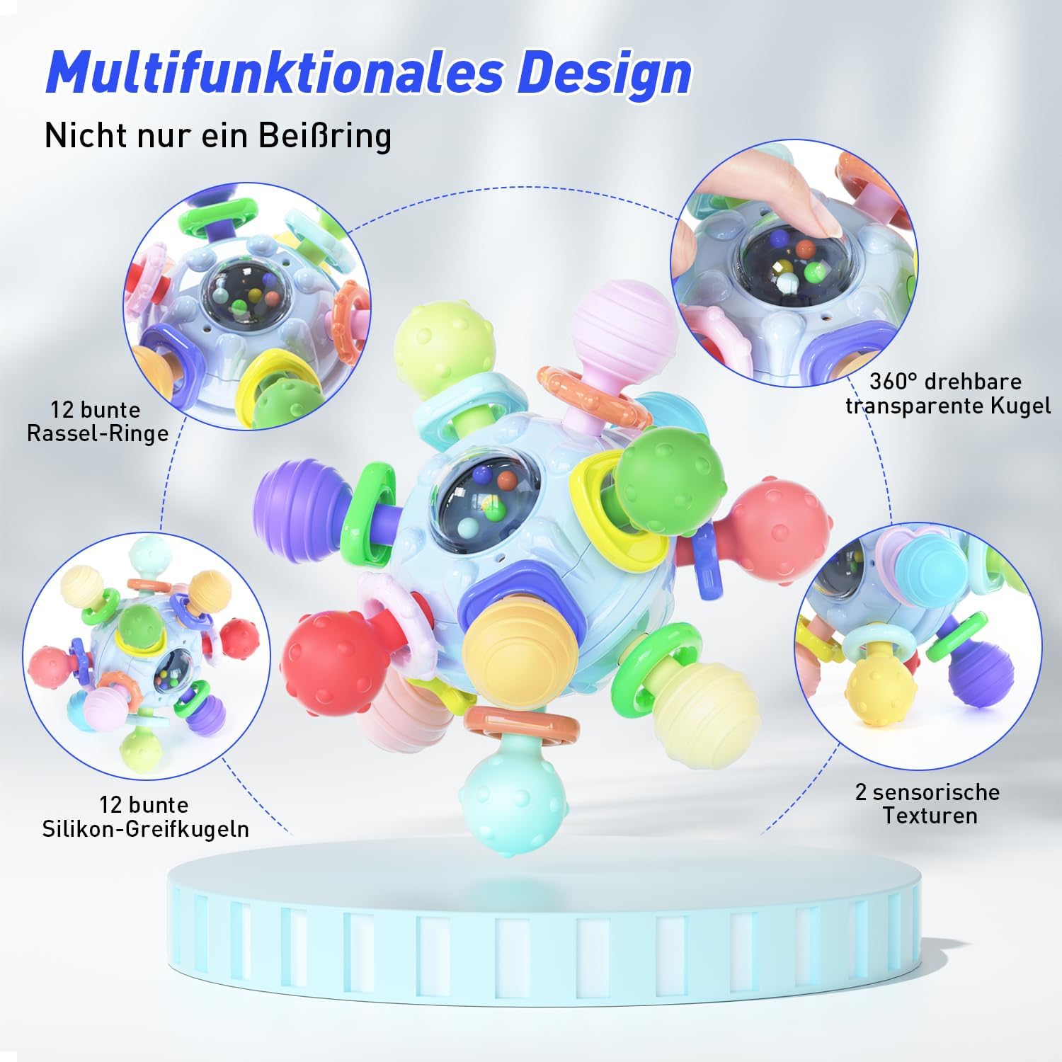 Dieses Montessori Spielzeug ist ideal für Babys im Alter von 0 bis 12 Monaten. Es kombiniert eine Rassel und einen Beißring aus hochwertigem Silikon, um die sensorische Entwicklung und das Greifen zu fördern.