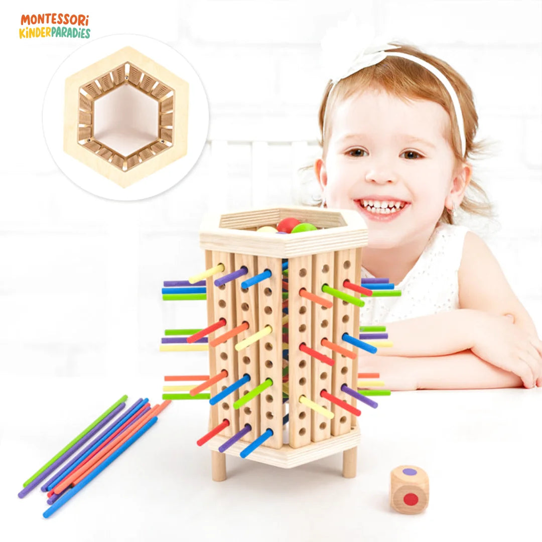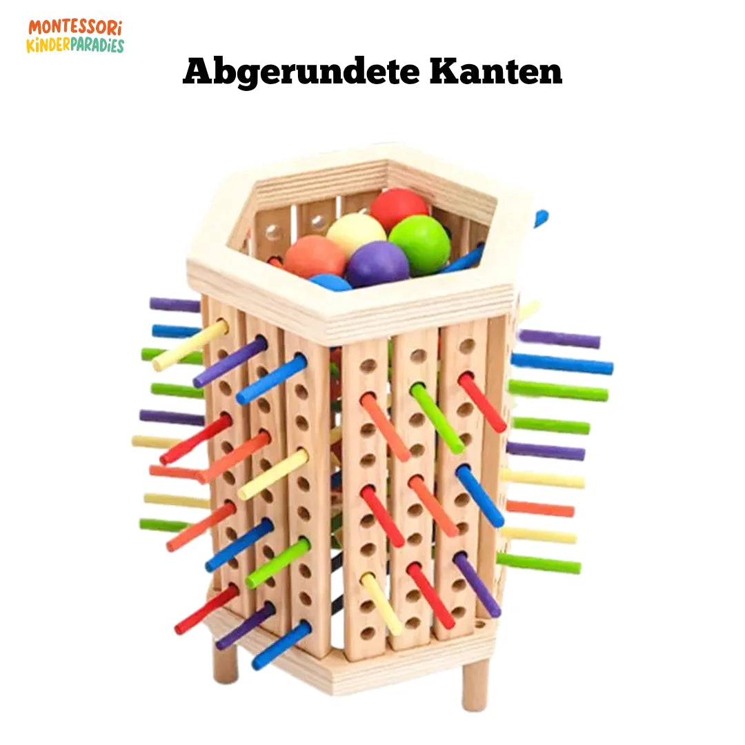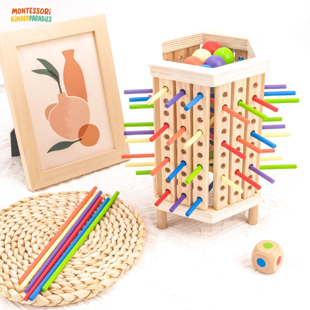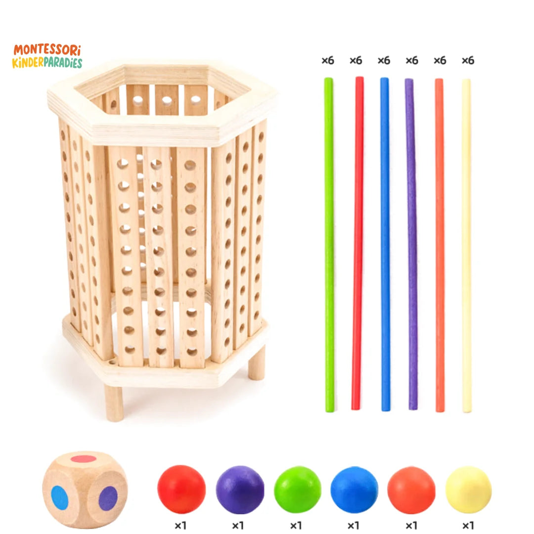 - Produktinhalt: 1 Holz-Turm, 36 Holzstäbe in 6 Farben, 6 kleine Bälle, 1 Würfel.