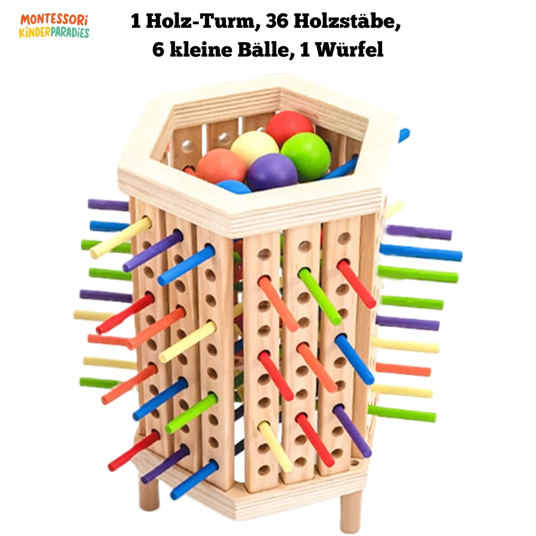 - Verpackungsinhalt: 1 Holz-Turm, 36 Holzstäbe, 6 kleine Bälle, 1 Würfel