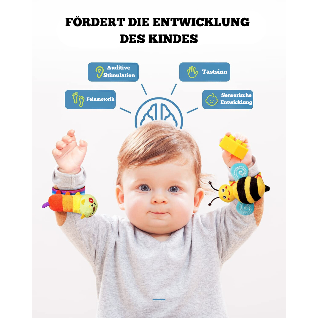 Diese süßen Plüschsocken und Armbänder bieten Deinem Baby nicht nur stundenlangen Spielspaß, sondern fördern gleichzeitig wichtige sensorische Fähigkeiten. Perfekt für kleine Entdecker, die gerne mit Farben, Geräuschen und Texturen spielen!